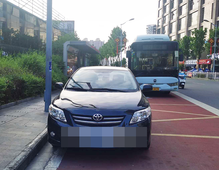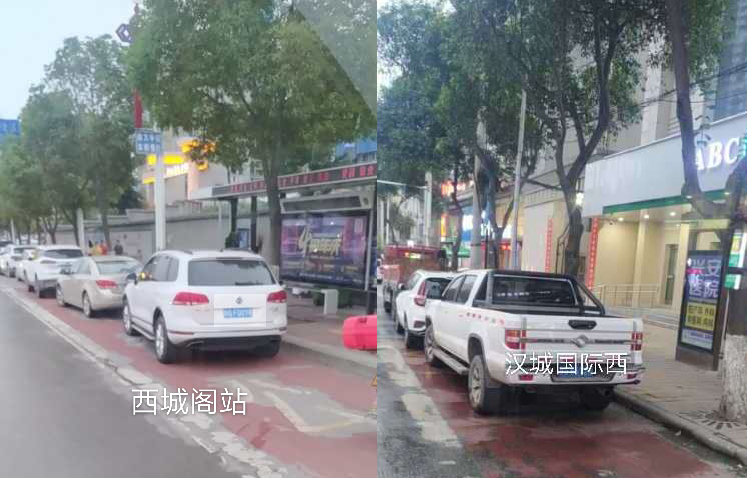 在金州廣場南站,十幾輛私家車“整齊劃一”的停在公交車站位置,地面紅色區(qū)域上的公交兩字也被完全覆蓋,從遠(yuǎn)處望去,站牌旁坐著幾個(gè)人正等待公交車的到來。在興華名城站,一輛私家車??吭诠卉囌厩?,駛來的公交車無法按其規(guī)定進(jìn)站停車。在西城閣站和漢城國際西站,幾輛私家車甚是“任性”,儼然將公交車站當(dāng)成了“停車場”,筆者在此駐足十幾分鐘,它們依然“紋絲不動”,有的車上甚至沒有車主。