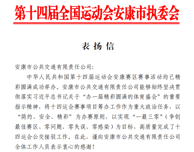 近日,第十四屆全國運動會安康市執(zhí)委會向市公交公司發(fā)來表揚信,對公交公司高質(zhì)量完成十四運會公交接駁工作表示感謝。